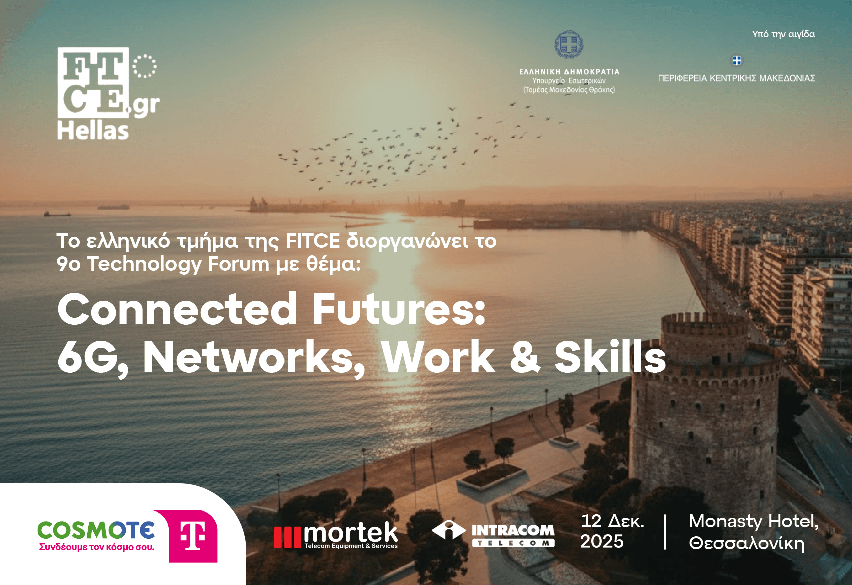 Η FITCE Hellas, υπό την αιγίδα του Υπουργείου Εσωτερικών, Τομέας Μακεδονίας και Θράκης, καθώς και της Περιφέρειας Κεντρικής Μακεδονίας, ανακοινώνει τη διοργάνωση της ημερίδας “Connected Futures: Redefining Work, Networks and Skills in the 6G Era”, η οποία θα πραγματοποιηθεί στις 12 Δεκεμβρίου 2025 στο Monasty Hotel, στο κέντρο της Θεσσαλονίκης.